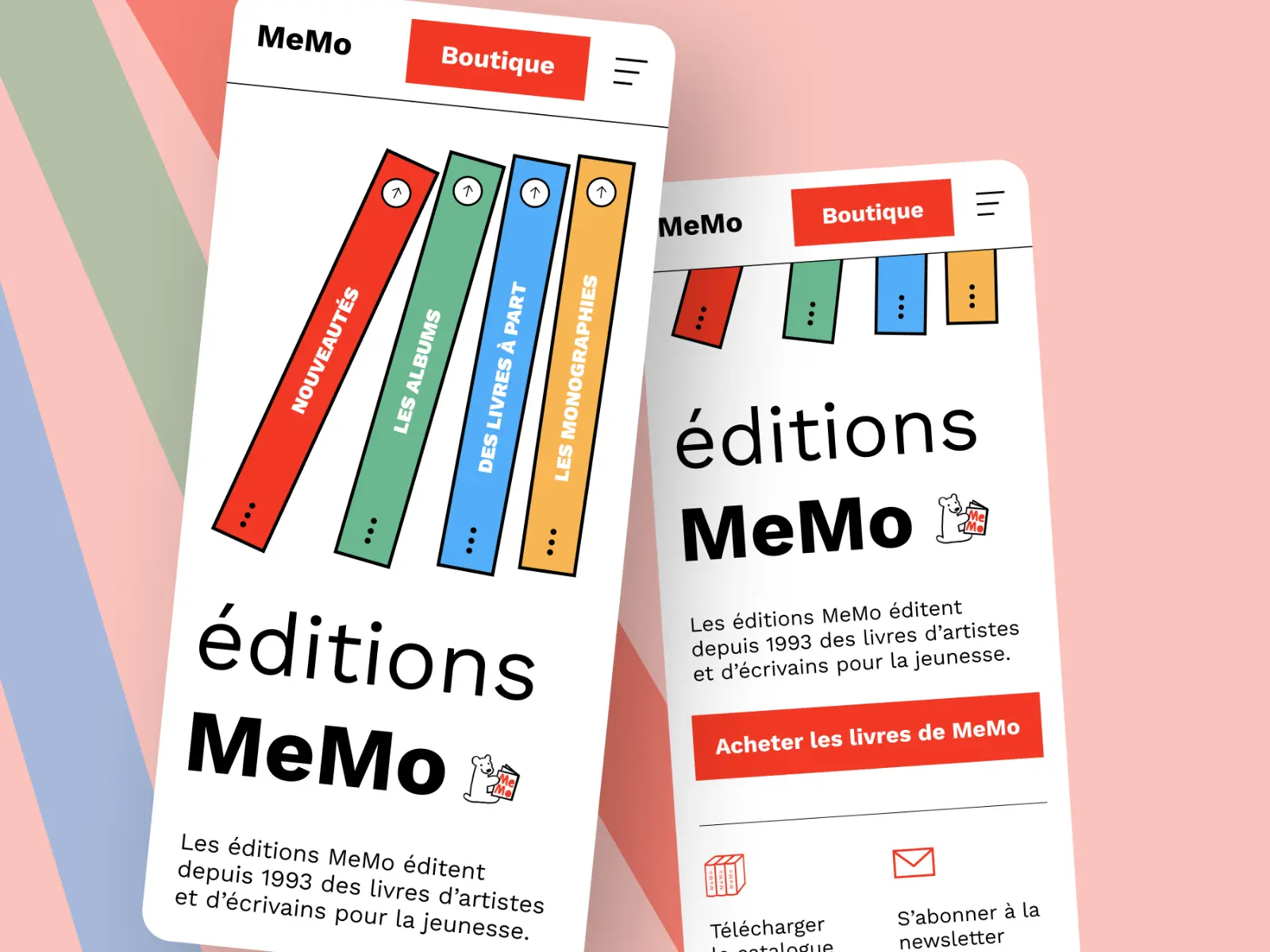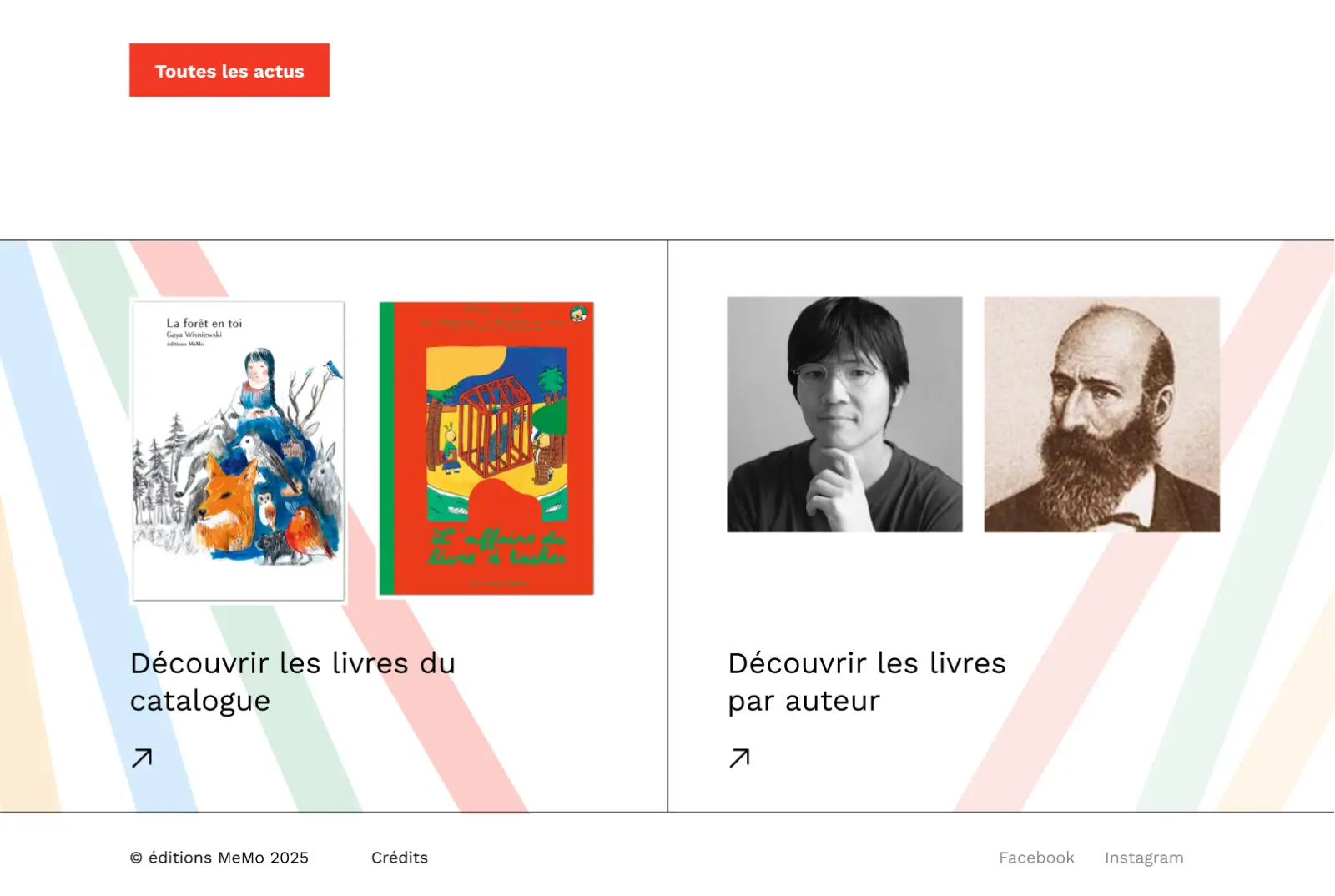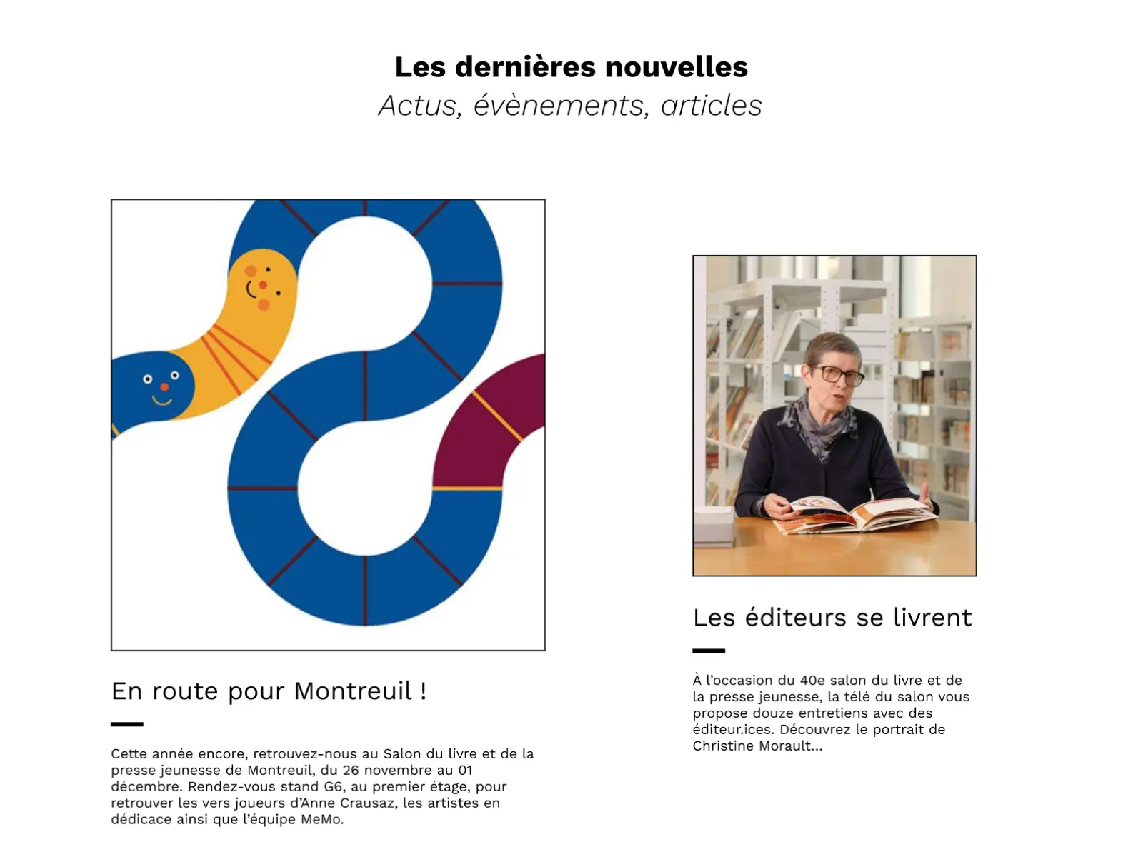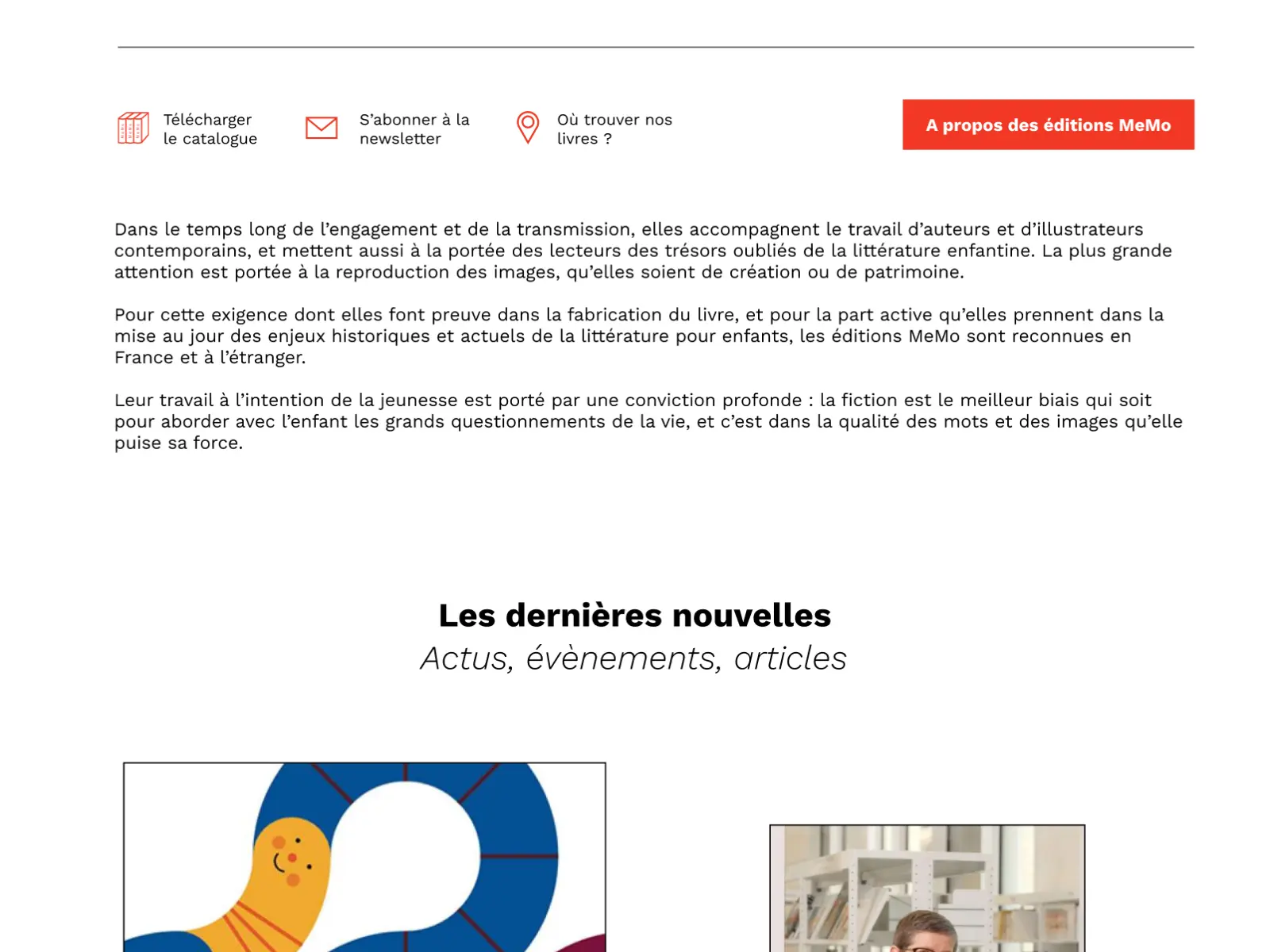 Imaginer une autre version de la page d'accueil de la maison d'éditions MeMo. Cela part d'une inspiration personnelle, j'avais à coeur de donner ma version, sans prétention. J'ai choisi d'ajouter plus de couleurs et de rythme à cette vitrine, le thème s'y prête très bien.